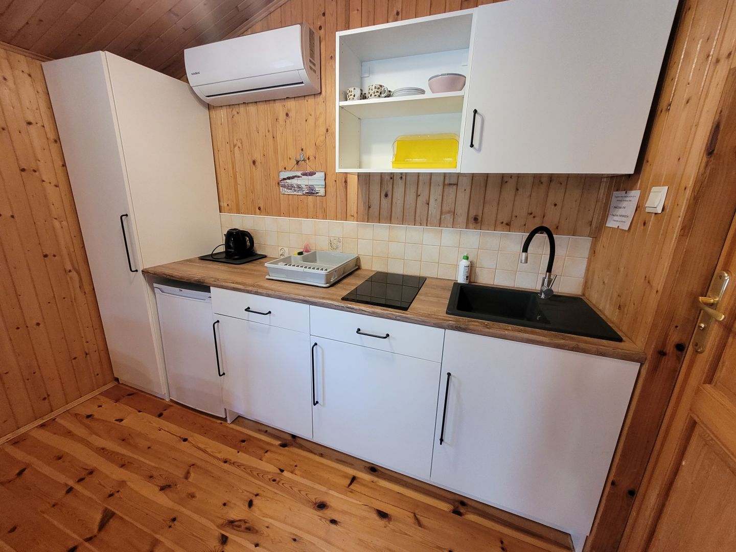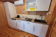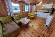 Salon z TV i aneksem kuchennym (kuchenka, lodówka, czajnik, zlew, sztućce, naczynia, garnki, kubki, talerze) - w salonie rozkładany narożnik (130 cm), ogrzewanie elektryczne.