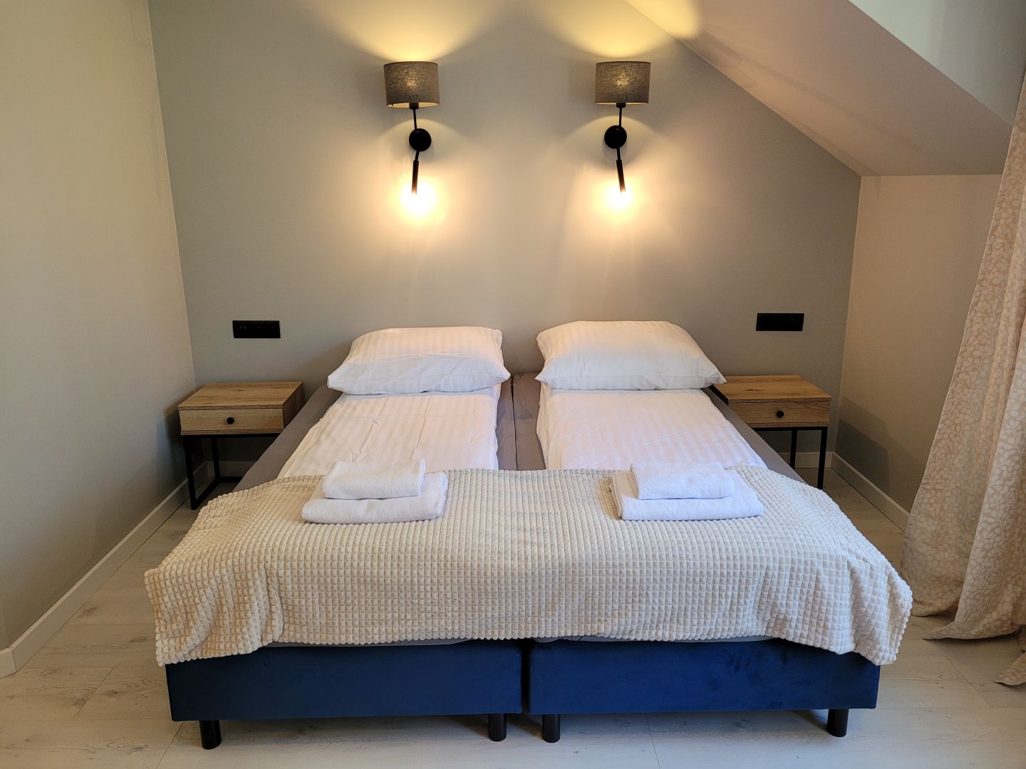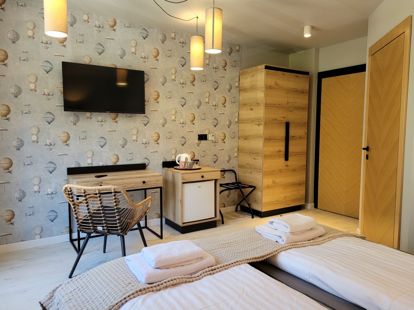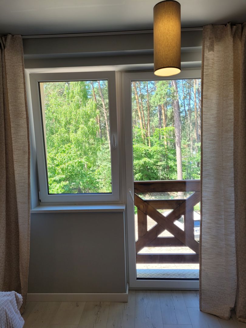 Dwa pojedyncze łóżka (można łączyć zatrzaskami) , TV, czajnik elektryczny, zestaw do herbaty, lodówka, łazienka z prysznicem, balkon francuski